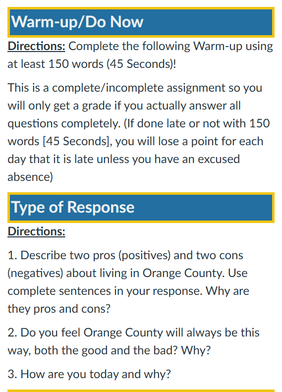 The first two questions connect to the lesson of the day or week, serve as a quick refresher, or even include fun community-building questions. The one thing they would answer every day is the third question: ‘How are you today?’ and ‘Why?’ This question goes a long way, but only if you make it meaningful. Many students want to talk to their teachers but feel that their teachers do not care for them. You need to set the standard that you will uphold and be an active presence in their lives. I would make it a goal of mine to read every student’s response when grading and always ensure that I follow up on responses the following day or by responding to them using the comment tab on Canvas. I learned about student interests, likes, dislikes, hobbies, and anything else you can think of.